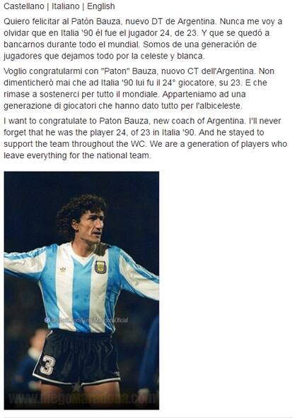 "Quiero felicitar al 'Patón' Bauza, nuevo DT de Argentina. Nunca me voy a olvidar que en Italia '90 él fue el jugador 24, de 23. Y que se quedó a bancarnos durante todo el mundial. Somos de una generación de jugadores que dejamos todo por la celeste y blanca", escribió Maradona en su cuenta de la red social Facebook.