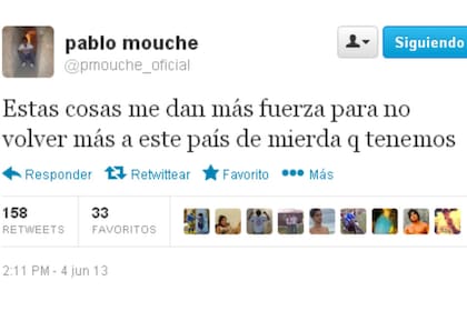 En la red social, Mouche aseguró: "Estas cosas me dan más fuerza para no volver más a este país de mierda que tenemos".