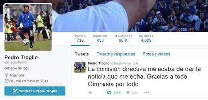"Culpable de todo". Un rato después de conocer la decisión de los dirigentes de Gimnasia de echarlo, Pedro Troglio puso en su biografía de Twitter "Culpable de todo". "Soy un tipo impulsivo, fue la calentura del momento", explicó y quitó eso de su cuenta en la red social.