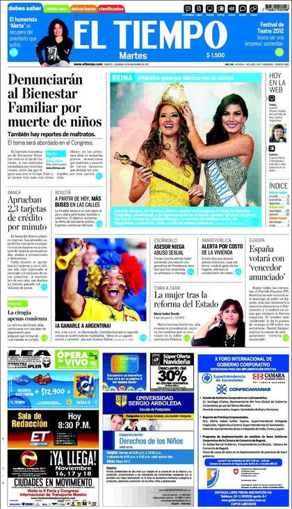 BARRANQUILLA.- A las 18, de nuestro país, la selección argentina visitará a Colombia en la cálida Barranquilla. Mientras, en esta ciudad, hay expectativa por ver a Lionel Messi, algo que queda claro en cada movimiento del equipo de Alejandro Sabella, en Colombia en la antesala del partido el interés, además del match de hoy, lo domina la elección de la Reina de la Belleza, algo que domina la tapa de los principales diarios cafeteros.