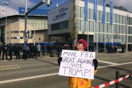ZURICH, Suiza.- Horas antes del inicio de la votación para elegir al nuevo presidente de la FIFA, varias personas se acercaron a la puerta del máximo organismo del fútbol en Zurich para protestar contra algunos de los candidatos que buscan ocupar el lugar que dejará Joseph Blatter.