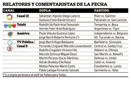 Rodolfo De Paoli -que relata en FPT desde que comenzó, en 2009- y Ariel Senosiain -nuevo integrante, comentarista de Torneos para los partidos de la selección- estarán durante todo el torneo en Telefé. Su presentación será mañana, a las 21, cuando Boca visite a Temperley. La segunda dupla que relatará y comentará los juegos por esta pantalla está integrada por Hernán Feler (que relataba por DirecTV) y Ariel Rodríguez (comentarista de TyC Sports), quienes debutarán en estas transmisiones con el duelo entre Argentinos Juniors y Tigre, mañana a las 17.