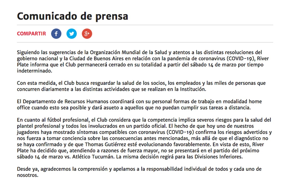 "River Plate informa que el Club permanecerá cerrado en su totalidad a partir del sábado 14 de marzo", menciona el escrito. En las instalaciones de la entidad se desarrollan numerosas actividades deportivas e incluso hay un instituto de educación de cuatro niveles: inicial, primario, secundario y terciario. Además, funciona el Museo, que ya estaba cerrado por el mismo motivo.