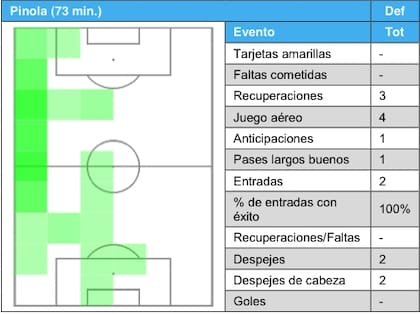 Hasta puede darse el lujo de enrocar posiciones en la defensa sin que esto baje el promedio de las proyecciones de los laterales o de los anticipos y recuperaciones de los centrales. Ante Newell’s, modificó la línea de 4 sin problemas: arrancó con Alvarez, Donatti, Pinola y Villagra; luego, a los diez minutos, la cambió a Villagra, Alvarez, Donatti y Pinola, para que los laterales suban, ayuden a Montoya y Fernández, y le den más pelea a la superpoblación de volantes de Newell’s. Y cuando debió salir Pinola, finalizó con Salazar, Donatti, Alvarez y Villagra. Pinola , ya sea como central o lateral, es un jugador que llegó para jerarquizar el fútbol argentino, uno de esos líderes positivos que aportan soluciones y un gran recorrido (en el gráfico, su mapa de calor en el clásico, de la empresa opta, y sus estadísticas).
