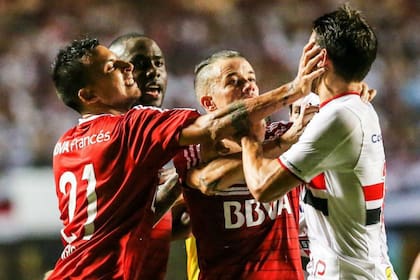 De regreso al país luego de la derrota en el Morumbí frente a San Pablo (1-2), el defensor de RiverLeonel Vangioni admitió su equivocación por la acción en la que agredió a Jonathan Calleri , autor de los dos goles del equipo brasileño, y que le costaron la expulsión, con una sanción que podría ser de tres fechas, por lo que se perdería el partido de cierra de la etapa de grupos y los partidos de octavos de final de la Copa Libertadores de América.