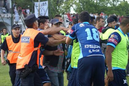 Dentro del campo de juego, jugadores de Luján persiguieron a un fotógrafo de un medio partidario de San Telmo, al que acusaron de insultar y tirar piedras, lo que a su vez generó un tumulto entre futbolistas y allegados. Cristian Bustos, de Luján, terminó con una herida en el oído, y lo mismo sucedió con Eduardo Rilo, presidente del club local, que habría sido golpeado por un allegado al club de la isla Maciel. Otros futbolistas de San Telmo debieron ser atendidos en medio de la cancha luego de recibir varios golpes.