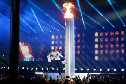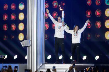 Ya sobre el final, los relevistas de la antorcha aparecieron corriendo en una cinta mecánica. Pudo verse a Gabriela Sabatini, Sebastián Crismanich, Paula Pareto y Walter Pérez. La llama iba de un lado a otro. Hasta que llegó el momento cumbre: el encendido del pebetero de estética minimalista, rodeado por los 4 mil atletas, en el que participaron la propia Peque Pareto y Santiago Lange, los dos medallistas dorados en Río 2016.
