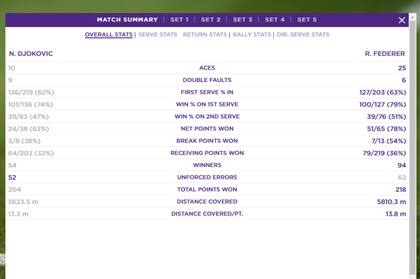 Más allá de que se vio una final pareja desde el resultado, las estadísticas oficiales mostraron como Federer logró dominar en 12 de 13 de los ítems principales. Más efectividad en los saques, más puntos ganados, más dominio de la red, más winners (el suizo dominó 94-54), más distancia recorrida. A los 37 años (cumple 38 en agosto), tuvo un gran rendimiento en la definición, pero falló en los errores no forzados (52-62 para el serbio).