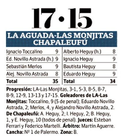 Cancha 1 de Palermo, la de unas cuantas hazañas de los Heguy. Reaparición en ella al cabo de cuatro años para los múltiples campeones. Partido importante, cuasi cuarto de final. Seis minutos del 7° chukker. Un resultado que había sido 12-9 y ya estaba en 12-13. Parecía que a La Aguada-Las Monjitas le pasaría una vez más: flaquear en desenlaces cerrados. Pero en el momento más caliente, cuando Chapaleufú parecía tirarle encima la historia, la combatividad y las mañas, dieron más la cara los dos nuevos del equipo azul, Ignacio Toccalino y Sebastián Merlos, y con cinco goles suyos en los últimos 8 minutos el conjunto de los Novillo Astrada se impuso al siempre favorito del público por 17 a 15 en su debut en este Argentino Abierto, por la Zona B.