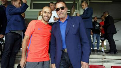Schwarzenegger compartió unos minutos con el brasileño Neymar, además de con dos de los capitanes del equipo, Sergio Busquets y Javier Mascherano antes del arranque de la práctica.