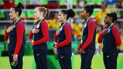 Ayer, en el Parque de Barra de Tijuca, Douglas, de 20 años, junto con sus compañeras, entre ellas la afamada Simone Biles, logró su tercer oro olímpico (los otros dos fueron en Londres 2012) en la prueba por equipos. Todo era sonrisas hasta que se viralizó la foto de la atleta en el momento del izamiento de la bandera de Estados Unidos con la ejecución simultánea del himno. Sus cuatro compañeras de equipo cumplieron con el ritual del país: apoyar la mano derecha sobre el corazón, pero ella no. Sus manos sostenían un presente que se le otorga a los participantes, además de la medalla.