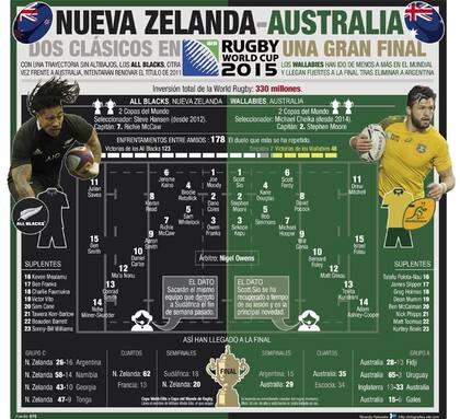 Los protagonistas de la Bledisloe Cup, una de las Copas más antiguas en el rugby mundial, se enfrentarán por primera vez en una final de un Mundial. Será un partido, además, entre los dos mejores seleccionados del momento. Los All Blacks, defensores del título, han sido prácticamente imbatibles en los últimos cuatro años. Uno de los pocos que los vencieron fueron, precisamente, los Wallabies, y en la definición del reciente Rugby Championship.