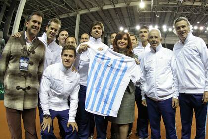 Tras inaugurar la exposición de Tecnópolis, la presidenta Cristina Fernández de Kirchner saludó a los integrantes del equipo argentino de Copa Davis y se llevó una camiseta autografiada por los jugadores y el capitán Orsanic.