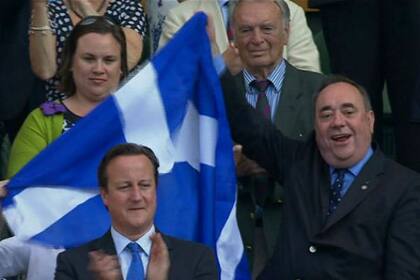 Parecía una linda historia en la que el deporte podía hacer olvidar las diferencias políticas. Pero cuando Murray se arrodilló en el césped, el dirigente del Partido Nacional Escocés hizo flamear una bandera escocesa justo detrás de Cameron y encendió de inmediato la controversia. Según "The Daily Telegraph", el gesto de Salmond viola las estrictas normas del All England Club, que prohíbe banderas que tengan más de dos por dos pies (0,6 x 0,6 metros) u objetos que impliquen "mensajes políticos".