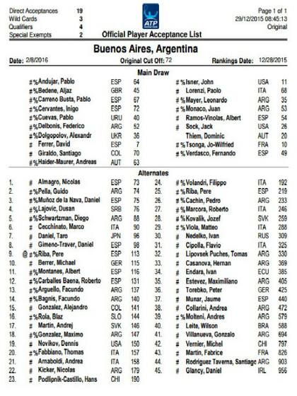 El corte de ingreso se cierra con el español Iñigo Cervantes (72°), un ranking bastante elevado por tratarse de un torneo de la categoría 250 (la menor dentro de las cinco escalas del circuito mayor). Por el momento, sólo tres argentinos consiguieron entrar de manera directa: Mayer (35°), Federico Delbonis (52°) y Juan Mónaco (53°). Se verá a último momento si Guido Pella (74°) y Diego Schwartzman (88°) necesitarán invitaciones especiales para poder ingresar en el cuadro principal. "Sumaremos más jugadores locales con las invitaciones y seguro que nuestros chicos harán un buen papel en la fase previa. Aunque será difícil para nosotros decidir los wild-cards, porque quedan muchos afuera en el cuadro y también de la qualy. Durante muchos años no teníamos que pensar en dejar jugadores argentinos afuera ya que teníamos a nuestra propia Legión, pero ya no está y eso repercute en el cuadro", expresó el director del torneo, Martín Jaite, a canchallena.com. Además de los tres wild-cards, se agregarán cuatro jugadores más desde la clasificación -reducida desde el año próximo a sólo 16 jugadores-, que se disputará el 6 y 7 de febrero.