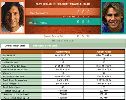 "Obviamente mi primera sensación es de bronca, de resignación. Sentís que estás jugando contra un frontón. Pero si pienso que después de lesionarme en Montecarlo los médicos me dijeron que sería complicado que llegara a Roland Garros, estoy satisfecho. Le gané a Raonic, haciendo un gran desgaste. Pero bueno, es difícil plantear un partido contra Nadal. Traté de ser más agresivo, aunque a veces me pasé de la cuenta. Cuando Rafa encuentra la manera de jugar, cuando se acomoda, se hace imposible. Y bueno, empecé bien, pero me fui quedando sin nafta", analizó Mónaco, que acarreaba dos partidos sin que le quebraran el servicio. Nadal ganó 83 puntos en el encuentro, mientras que Pico sumó 43.