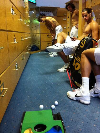 LONDRES.- Mientras esperan que comience Wimbledon, el tercer Grand Slam del año, que fue sorteado hoy , Juan Mónaco se divirtió jugando al golf en los vestuarios del mítico torneo inglés junto a los españoles Rafael Nadal, en N° 1 del mundo, y Feliciano López. Pico publicó la foto en su cuenta de Twitter .