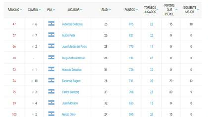 Desde otro punto de vista, el ranking desnuda la realidad de que la Argentina no tiene ningún jugador dentro de los 40 mejores desde que Delbonis dejó esa posición (40°) en la semana del 11 de julio pasado. No deja de ser un registro negativo, después de casi 17 años consecutivos con al menos un tenista albiceleste dentro de ese grupo.