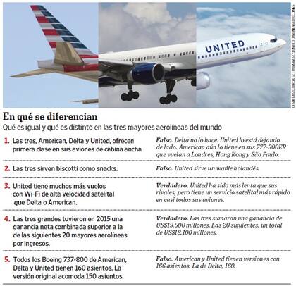 American, Delta y United, las tres grandes aerolíneas estadounidenses, son cada vez más parecidas. Las tres fueron creadas por la fusión de seis grandes aerolíneas durante los últimos ocho años y ahora cuentan con las ganancias necesarias para mejorar sus productos. Todas tienen la determinación de no dejar que un rival obtenga una ventaja de costo o producto.
