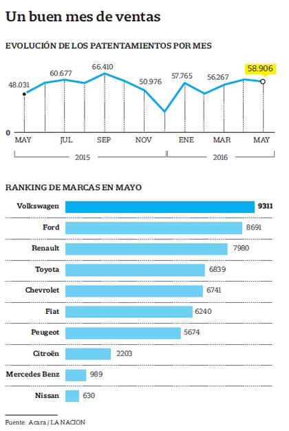 Sin embargo, la sobreoferta de automóviles en el mercado local, gracias a la mayor importación y al sobrestock de las terminales por la baja de exportaciones, impulsaron los patentamientos en los primeros cinco meses del año. Ayer los concesionarios nucleados en Acara informaron que en mayo se vendieron 58.906 vehículos (un alza interanual de 22,6%). En el acumulado anual, la suba fue de 8,7% con relación al mismo período de 2015.