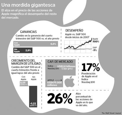 Desde 1980 a la fecha, otras cinco empresas, IBM, General Electric, AT&T, Microsoft y Exxon Mobil, tuvieron en algún momento una ponderación en el S&P 500 más alta que la de Apple a fines de diciembre. De todas maneras, "el impacto de Apple es inmenso", señala Howard Silverblatt, analista de índices de S&P Índices.