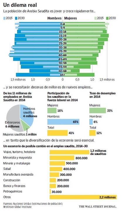 Las tendencias demográficas son abrumadoras. Un estudio del Instituto Global McKinsey estima que para 2030 el número de sauditas mayores de 15 años aumentará en unos seis millones, incorporando unas 4,5 millones de personas a la fuerza laboral. La cifra aumenta si las mujeres empiezan a trabajar en mayores cantidades.