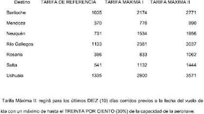 Las empresas podrán "aplicar las tarifas en clase económica que se encuentran dentro de las bandas tarifarias, entre la tarifa de referencia y las tarifas máximas I y II de cada uno de los puntos origen-destino descriptos en el anexo".