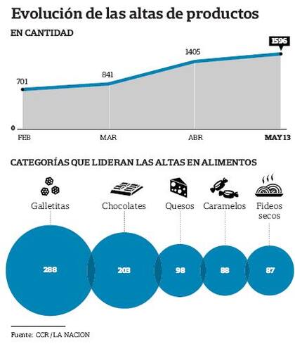 La mejor manera de medir el ritmo de lanzamientos en el mercado es tomar la evolución de altas de productos que realiza CCR, consultora que releva las ventas en los supermercados. Según este índice, en febrero pasado hubo 701 lanzamientos, coincidiendo con la puesta en marcha del congelamiento. En marzo, el índice registró un alza del 20%, con una inscripción de 841 nuevas referencias -o SKU, que es el nombre con que se identifica a los artículos en la jerga del sector- y a partir de abril se registró una fuerte aceleración, llegando a los 1596 lanzamientos en mayo, que implica un aumento del 127% frente a febrero.