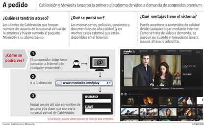 Anticipándose a ese fenómeno, Cablevisión y Moviecity presentaron MoviecityPlay, un servicio de video a demanda (VOD, por la sigla en inglés) de contenidos audiovisuales premium que está disponible desde hoy para los clientes de la operadora de TV por cable que tengan contratado Moviecity en el paquete. Según explicaron en las empresas, el cliente de Cablevisión, por medio de su nombre de usuario de la sucursal virtual de la empresa puede acceder a los principales títulos en exhibición de las señales del paquete premium de Moviecity, que incluye series, películas, conciertos y documentales para poder verlos, detenerlos, atrasarlos y adelantarlos. La dirección de acceso es www.moviecity.com/play.