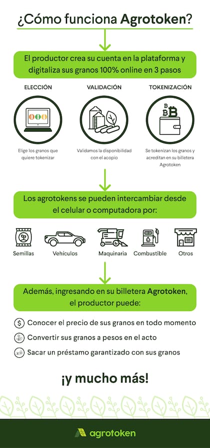 Agrotoken, empresa pionera en el sector agropecuario local, ofrece una infraestructura conformada por tres actores fundamentales que integran el proceso de su operación: los productores, los acopios y exportadores, y los comercios adheridos. De este modo, la cosecha, que antes quedaba inmovilizada, ahora se puede convertir en tokens y ser utilizados para adquirir insumos, servicios, ahorrar o generar garantías para préstamos o herramientas de financiación.