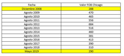 La confirmación de parte del Gobierno de EE.UU. de nuevas subas de aranceles el viernes pasado a productos provenientes de China hizo que el precio de la soja llegara a los valores más bajos de los últimos 11 años. Si observamos los precios Chicago, como se ve en el siguiente cuadro de los últimos años, fue en diciembre de 2008 donde el valor de la soja era muy parecido al actual.
