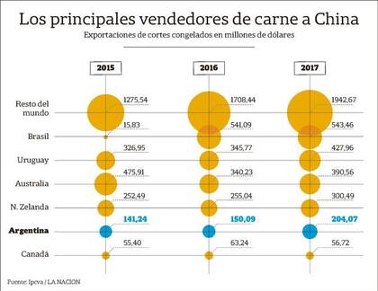"Hace siete años era cero la importación global de China y este año estará cerrando en un millón de toneladas. Están consumiendo de siete a ocho kilos por habitante", señaló Víctor Tonelli, consultor en temas ganaderos. Ésa es la compra formal china. En tanto, si se suma la importación indirecta que llega a ese mercado vía Hong Kong y Vietnam, en 2017 China podría alcanzar compras por 1,5 millones de toneladas, lo que la ubicaría como el principal comprador del mundo, superando a los Estados Unidos.