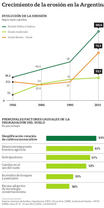 Lo cierto es que el importante incremento en las estimaciones de erosión hídrica y eólica correspondiente al 2015 conspira contra la sustentabilidad de los modelos productivos actuales. La erosión hídrica se llegó a duplicar en este último cuarto de siglo, con 34,6 millones de hectáreas afectadas.