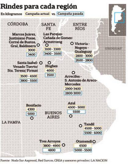 Otro informe, en este caso de técnicos de Red Surcos, refleja también rindes menores en el sudeste y norte bonaerense y el centro sur de Santa Fe. En cambio, se dieron mejores rindes versus el ciclo pasado en Entre Ríos (Victoria-Nogoyá-Gualeguay) y el oeste bonaerense (Trenque Lauquen-Villegas).