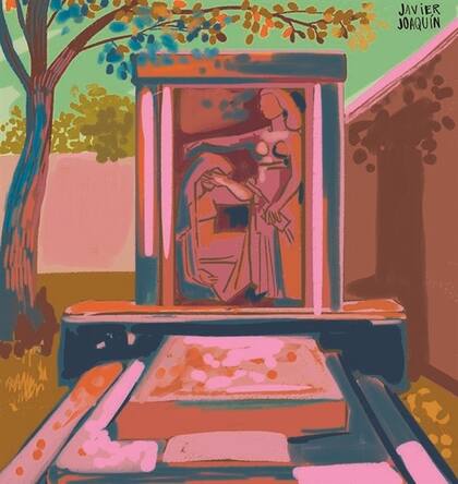 Dos jóvenes mujeres vestidas con kiton presiden la lápida. Figuras esculpidas de perfil. Fueron delineadas en el granito oscuro y se parecen a griegas, donde una, de pie, con disposición piadosa, extiende la mano derecha y consuela a la otra, arrodillada. Esta última cubre su rostro con la mano derecha, en actitud de llanto, y la otra mano posa sobre un reloj de arena: es el tiempo que fagocita incansable nuestras horas, deslizándose voluptuosamente inerte.