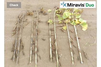 En este caso, el aporte de Miravis Duo también es clave, ya que brinda hasta 2 mil kg/ha más ante un lote no aplicado, disminuyendo la senescencia foliar anticipada por viruela y así bajando las pérdidas de rendimiento en la cosecha al momento del arrancado.