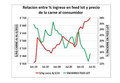 Ambos gráficos muestran la relación directa entre el ingreso de animales a corrales de engorde, cuyos periodos de engorde promedian entre 3,5 y 5 meses, el precio de la carne al consumidor y el costo del alimento, en este caso basado en el valor del maíz. Cabe aclarar que el alimento participa entre el 85 y el 90% de los costos directos de los feedlots.
