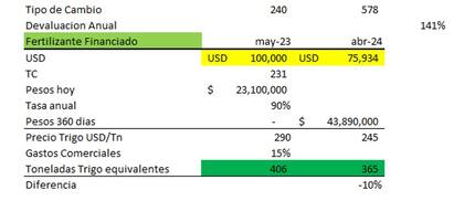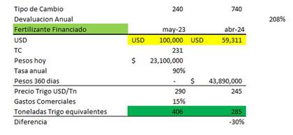 Pensemos en la necesidad de compra de fertilizantes por US$100.000 y dos alternativas de pago. Por un lado, pago con trigo disponible y por otro, pago con tarjeta rural a 360 días al 90% anual. Para un campo a 150/200 kms del puerto, hoy se necesitan 406 toneladas de trigo para cancelar el negocio.