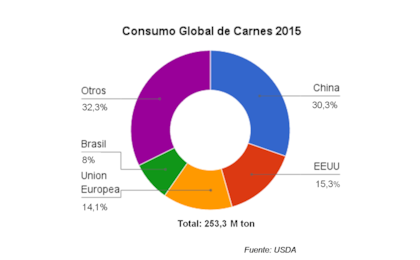China se ha convertido en el mayor consumidor global de carnes con un 30% del mismo, seguida por la Unión Europea (15%), Estados Unidos (14%) y Brasil (8%).