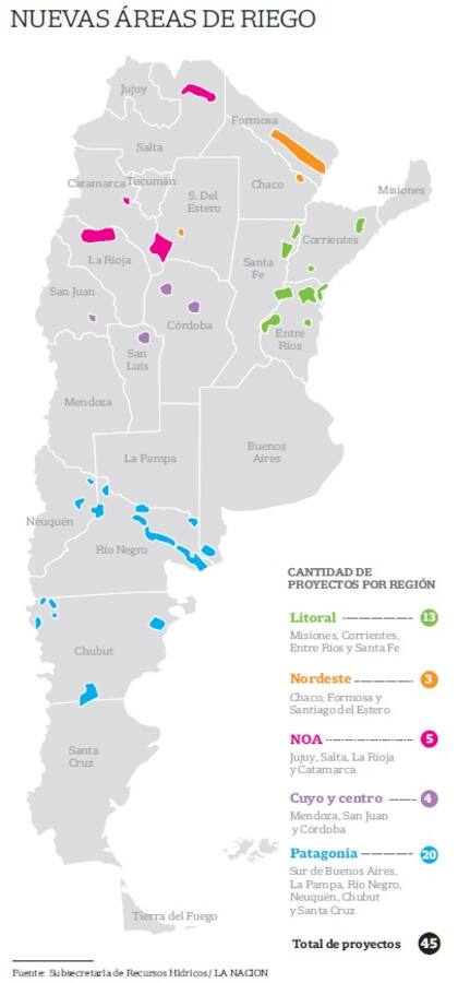 En su momento, UCAR identificó 16 áreas para analizar la expansión del riego en el país. El nuevo Gobierno subió la apuesta e hizo una consulta formal a todos los gobiernos provinciales. Los gobernadores respondieron y se pasó al análisis de 45 áreas, que representan más de 835.000 hectáreas en 17 provincias. Concretar todas esas áreas bajo riego requeriría una inversión de 4254 millones de dólares y tendría como impacto social en las diversas regiones la creación de 426.309 empleos.