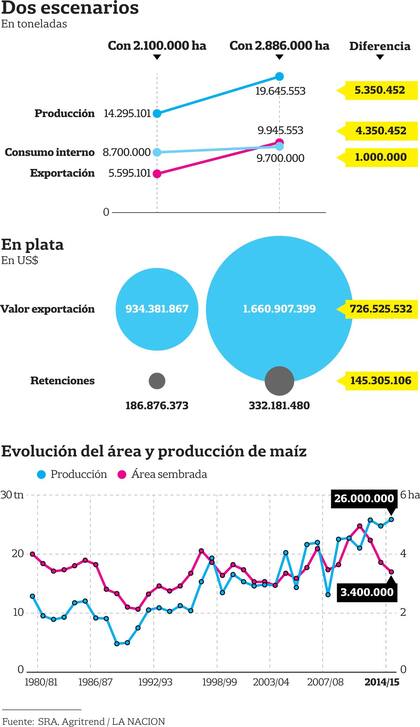En el Instituto de Estudios Económicos y Negociaciones Internacionales de la Sociedad Rural Argentina (SRA) manejan un área comercial con 2,88 millones de hectáreas. Igual, hicieron un ejercicio para La Nacion sobre qué ocurriría con 2,1 millones de hectáreas. En este escenario, la producción retrocedería 43% (de 25,04 a 14,2 millones de toneladas), las exportaciones un 60% (de 14,04 a 5,59 millones de toneladas) y el ingreso por divisas y retenciones divisas también se desplomarían 60%. Las divisas caerían de US$ 2360 millones a US$ 934 millones (US$ 1426 millones menos) y el cobro por retenciones bajaría de US$ 472 a US$ 186,8 millones (US$ 286 millones menos).