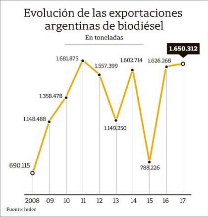 Ayer había rumores de que la medida había sido acordada con la industria local, pero fuentes del sector lo negaron. En tanto, en entidades gremiales del agro temían que se traslade al precio del productor el efecto de la medida, con un descuento. Según señaló Gustavo Idígoras, presidente de la Cámara de la Industria Aceitera y el Centro de Exportadores de Cereales (Ciara-Cec), entre exportaciones realizadas y por concretar, en lo que va del año ya suman 580.000 toneladas, en un 90% a Europa. También se hicieron operaciones a Canadá, Perú y Malta. En este último caso, el producto es recibido por refinerías que luego lo mandan para competir con el gasoil en África, según explican en el sector.