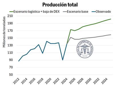 En cuanto a los volúmenes de producción, la BCR señala que la producción total proyectada para 2035 alcanza los 202 millones de toneladas (Mt), lo que implica un crecimiento del 26,7% en relación con los 159,3 Mt del escenario base.