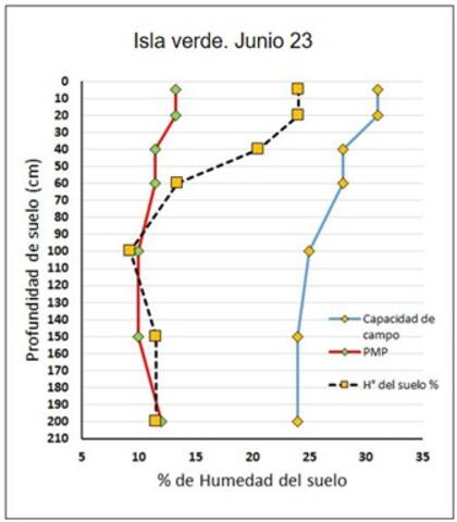 En el perfil del suelo ya estábamos en punto de marchitez permanente (PMP) a escasos 40 centímetros de profundidad en la localidad de Isla Verde al momento de la siembra. Pero la humedad en los primeros centímetros de suelo no estaba tan mal para intentar una siembra y esperar que el Niño se adelante un poco y nos ofrezca algo de precipitaciones durante su ciclo.
