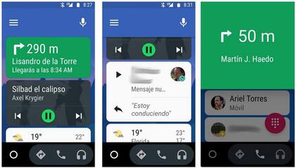 Android Auto tiene una vista inicial donde muestra algunas tarjetas de datos (el estado del tiempo, las últimas llamadas, por ejemplo). Después ofrece tres alternativas: la primera es acceder a los mapas y a la navegación guiada, muy similar a como funciona con el teléfono en su modo estándar, pero con algunos agregados, como un cartel verde que aparece ocupando toda la pantalla cuando nos acercamos a una esquina en la que tenemos que doblar o una salida de la autopista.