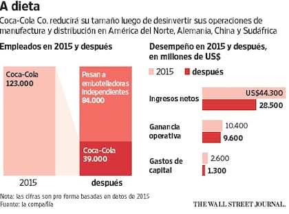 Desprenderse de operaciones con muchos activos tendrá un impacto importante. Coca-Cola estima que sus ingresos descenderán de US$44.300 millones en 2015 a US$28.500 millones este año debido a las ventas anunciadas el mes pasado. El margen operativo pasará de 23% a 34% y el personal se reducirá de 123.000 a 39.000 empleados conforme plantas, centros de almacenamiento y camiones que son intensivos en capital salen del estado financiero.