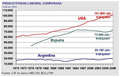 Productividad. Como podemos ver, en Estados Unidos la productividad media de las personas ocupadas fue en 2009 de 101.600 dólares por trabajador y en Argentina, para ese mismo año, llegó a 20.190 dólares por trabajador, es decir ellos logran 5,03 veces más producción por persona que nosotros, en promedio. Por eso los sueldos que pueden percibir son alrededor de 5 veces más altos que los nuestros.