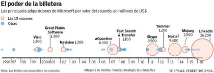 Microsoft Corp. ha comprado más de 150 empresas. Ese número de operaciones, sin embargo, ha quedado en segundo plano ante la prominencia de las adquisiciones que el coloso del software no pudo concretar o que se arrepintió de haber hecho.