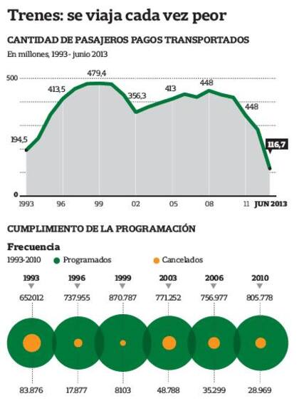 "Tenemos mil deficiencias. Tenemos que trabajar con un sistema de señalamiento obsoleto, no funcionan las comunicaciones ni las vías, las locomotoras tienen décadas.", dice Zamora. Pero además hay que agregar la furia de los pasajeros, que viven día a día el deterioro del servicio que, según datos que están en la CNRT, se incrementó en los últimos 12 años en la red ferroviaria metropolitana de Buenos Aires. Como ejemplo, en 2001 había 910.295 trenes programados, 27.927 cancelados y 28.445 atrasados; en 2010, unos 100.000 menos trenes programados: 805.778, más 28.969 cancelados y 88.075 atrasados.