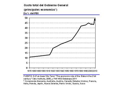 Posteriormente, y eso en todo el mundo desarrollado, especialmente en Europa, se completó este desarrollo con la idea que el Estado debía lograr o procurar la felicidad de los habitantes, el Estado del Bienestar. Éste fue financiado primero con altos impuestos a la actividad productiva que fueron dejando al sector privado fuera de competencia con otros países, y luego, cuando no se pudo continuar incrementando la presión impositiva, mediante el endeudamiento público sin límites. Por todo ello en los países desarrollados, el gasto público pasó de un 10% del PBI en 1870, a un increíble 45% hacia el 2008 y aún creció más con la crisis actual del capitalismo geriátrico. Actualmente, el gasto público general llega casi al 50% del PBI. Estas tendencias también fueron del mismo signo en los países emergentes y en los subdesarrollados. Una evolución insostenible en el tiempo.